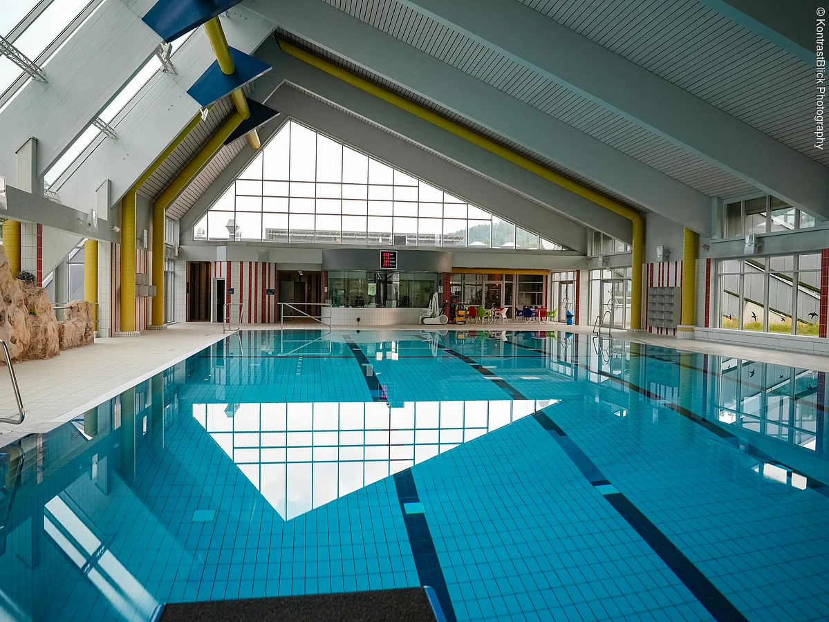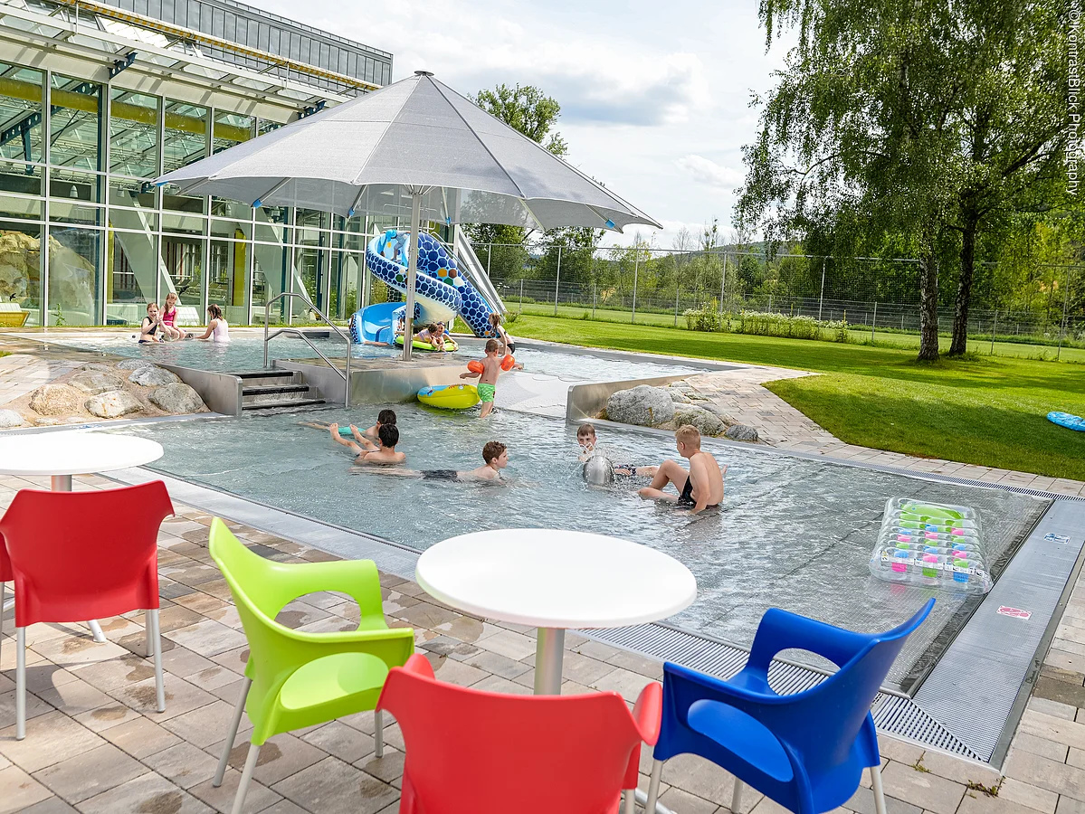 Fischvergnügt im Wasser! Das ganze Jahr über lockt das große Schwimmerbecken mit Nichtschwimmerzone und Massagedüsen zum Abtauchen. Im Sommer sorgt das Außenbecken mit Rutsche und Spielplatz noch zusätzlich für Spaß.