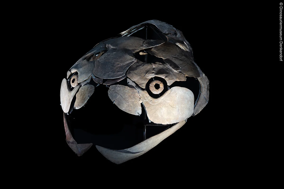 Urzeit-Gigant Titanichthys: Das Dinosaurier Museum Altmühltal zeigt den fossilen Schädel eines Titanichthys, eines gepanzerten Urfischs, der vor etwa 380 Millionen Jahren die Ozeane durchstreifte. Der außergewöhnlich gut erhaltene Fund stammt aus Marokko und zählt zu den wenigen bekannten Exemplaren weltweit. Mit seiner beeindruckenden Länge von über fünf Metern, einem gewaltigen Maul und massiven Knochenplatten gehört Titanichthys zu den größten Vertretern seiner Art und war dennoch, ähnlich wie der Riesenhai oder der Bartenwal, ein Filtrierer. Das heißt, er ernährte sich vermutlich von riesigen Mengen Plankton.